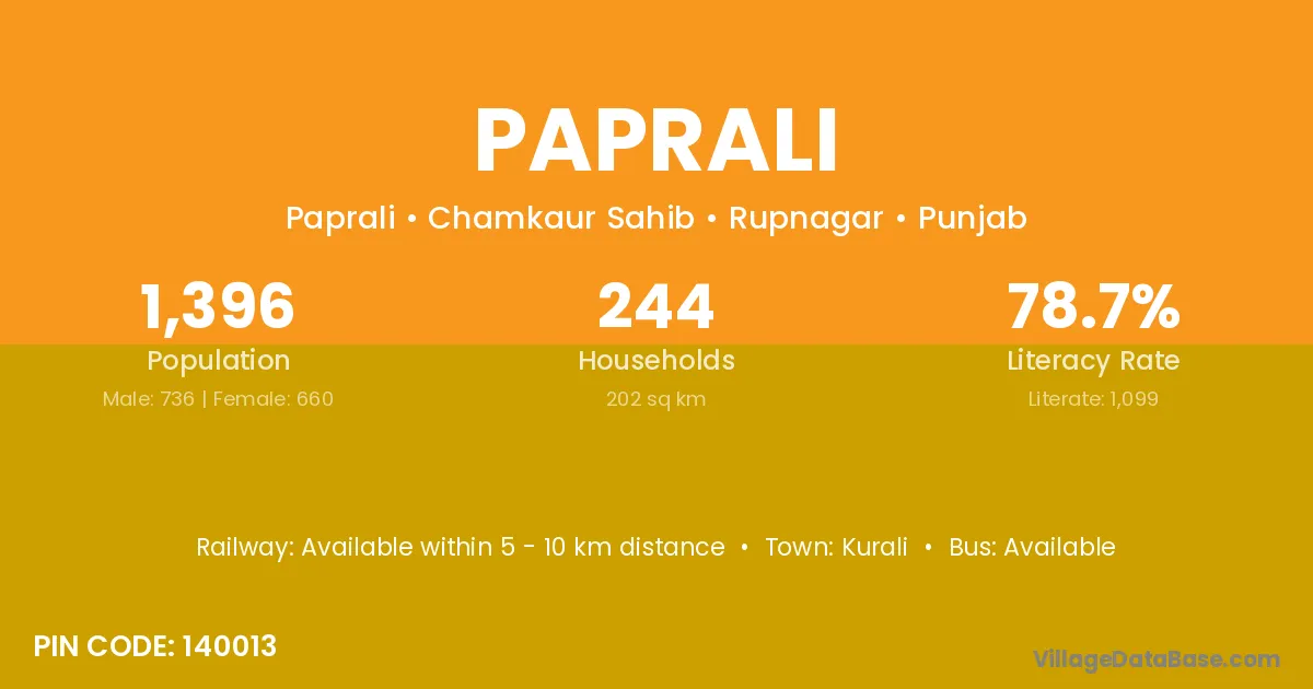 Paprali village has a total population of 1,396 people, of which 736 are males and 660 are females.