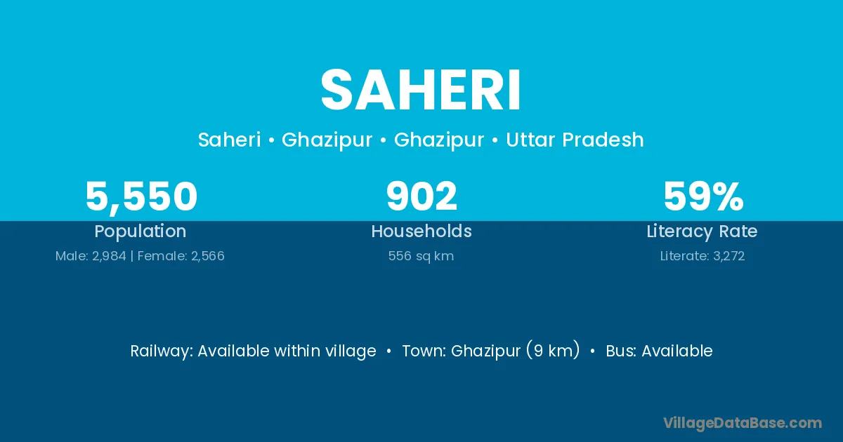 The literacy rate of Saheri village is 74.11%. Male literacy stands at 78.84% and female literacy at 68.56%.