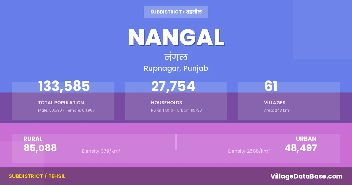 According to the 2011 census The total area of Nangal Tehsil is 243 km², with a population of 133585 people. The population density is 550 inhabitants per square kilometre, and there are approximately 27754 houses in the sub district.