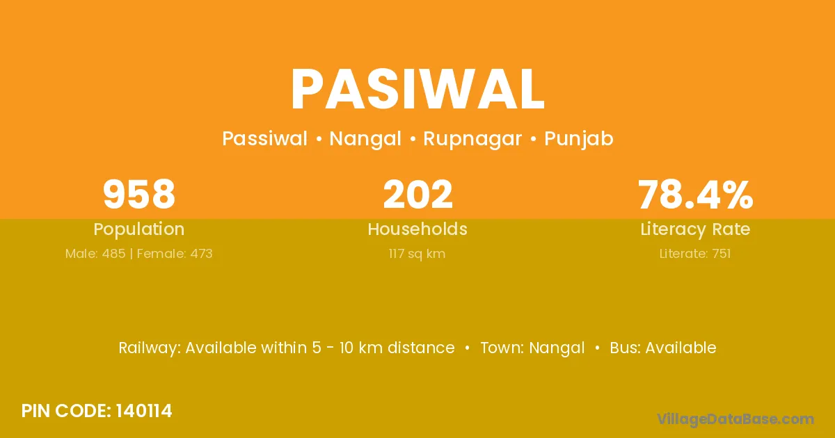 Pasiwal village has a total population of 958 people, of which 485 are males and 473 are females.