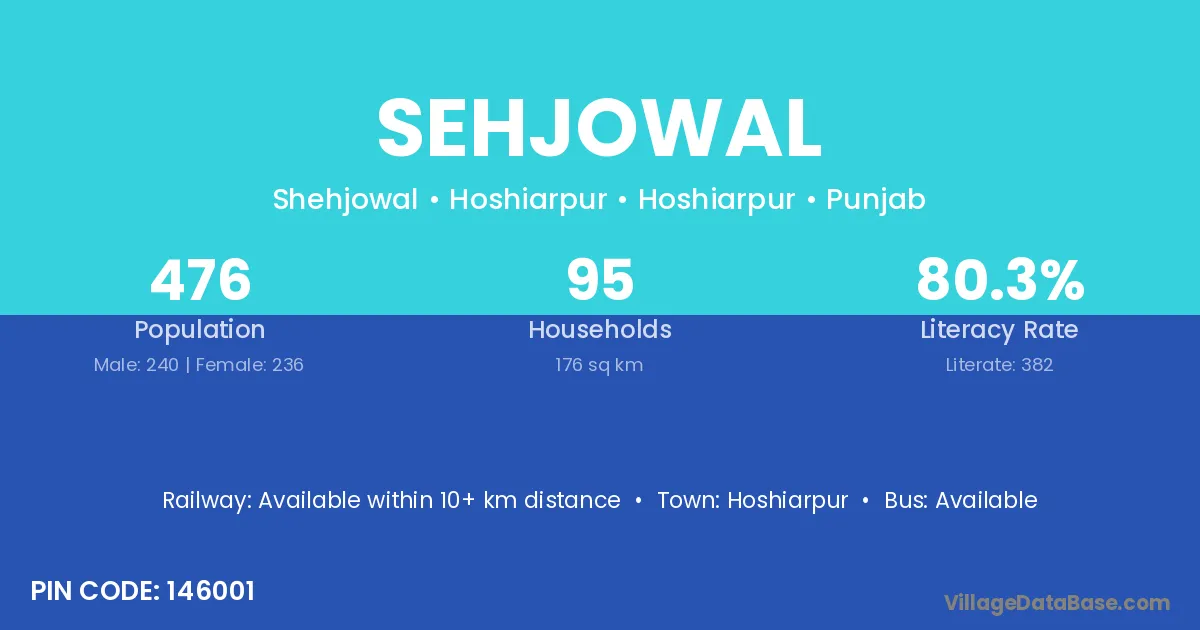 Sehjowal village has a total population of 1,843 people, of which 952 are males and 891 are females.