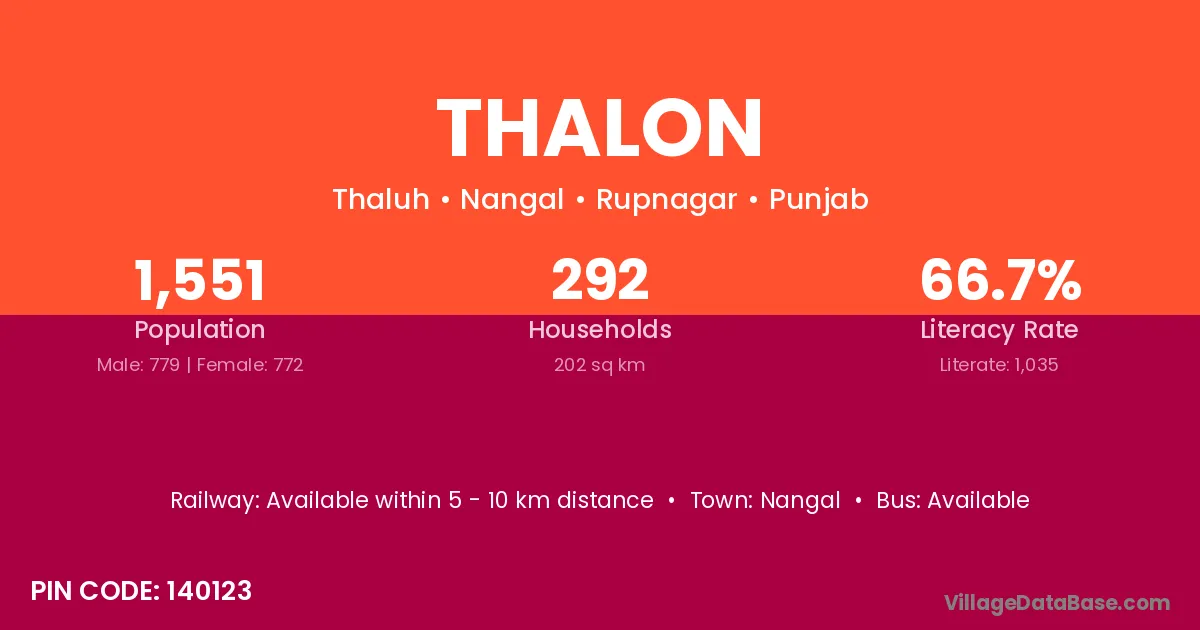 Thalon village has a total population of 1,551 people, of which 779 are males and 772 are females.
