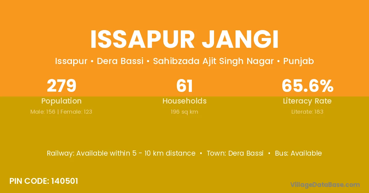 Issapur Jangi village has a total population of 279 people, of which 156 are males and 123 are females.