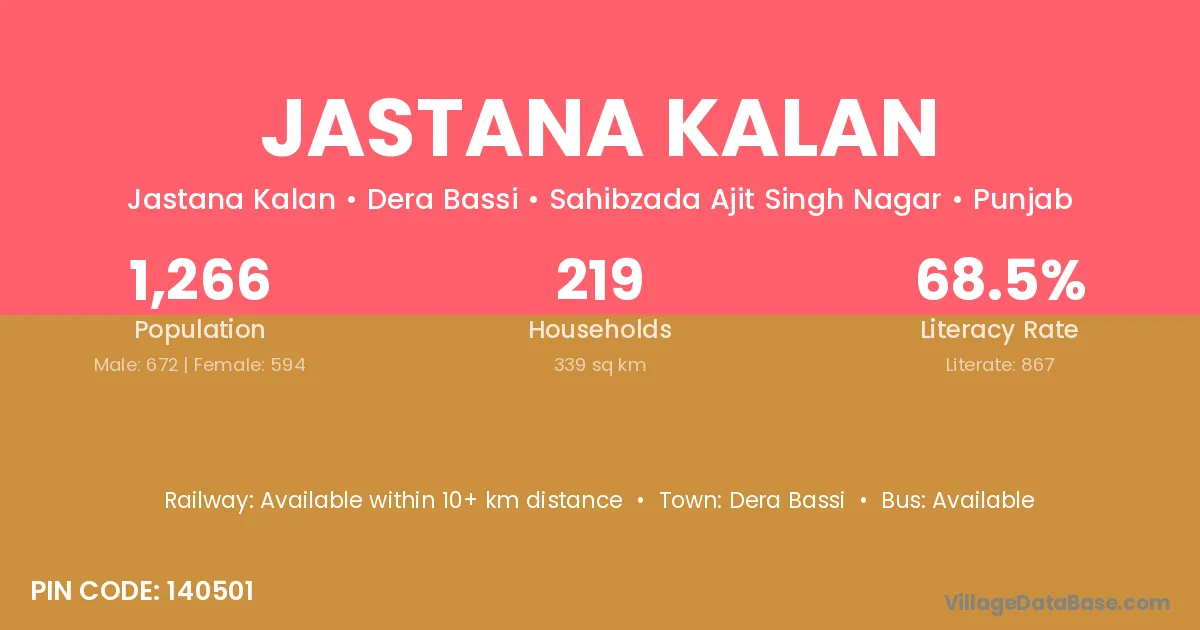 Jastana Kalan village has a total population of 1,266 people, of which 672 are males and 594 are females.