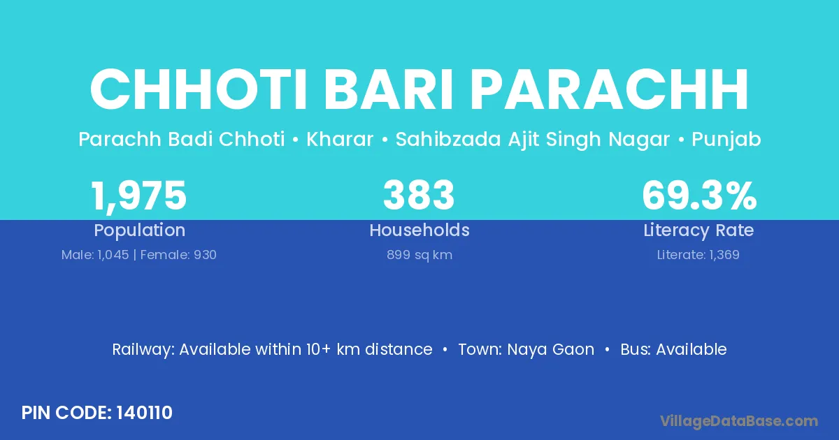 Chhoti Bari Parachh village has a total population of 1,975 people, of which 1,045 are males and 930 are females.