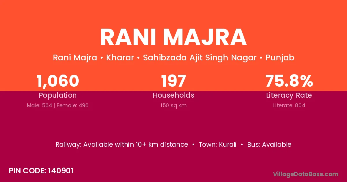 Rani Majra village has a total population of 1,060 people, of which 564 are males and 496 are females.