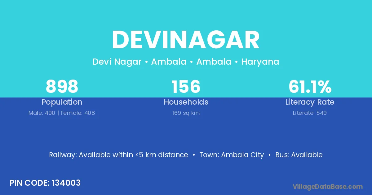 The literacy rate of Devinagar village is 76.45%. Male literacy stands at 80.80% and female literacy at 71.56%.