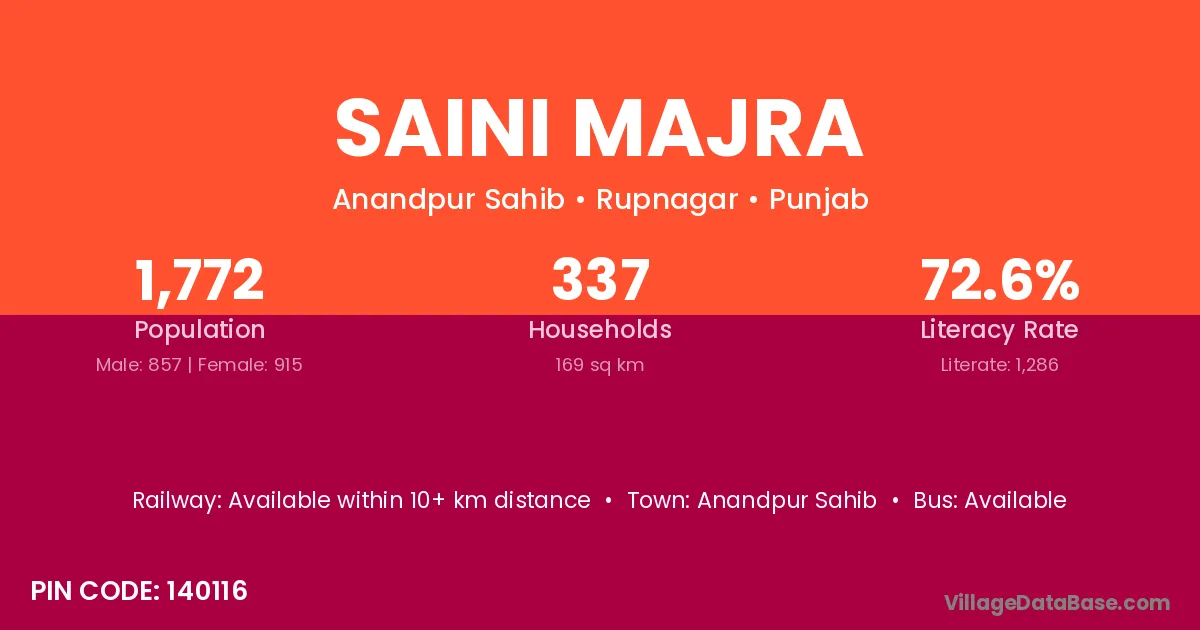 The literacy rate of Saini Majra village is 74.23%. Male literacy stands at 78.65% and female literacy at 68.92%.
