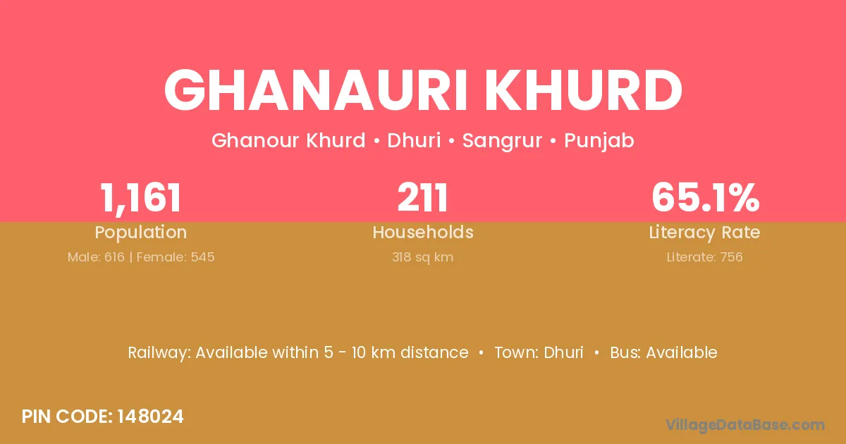 Ghanauri Khurd village has a total population of 1,161 people, of which 616 are males and 545 are females.