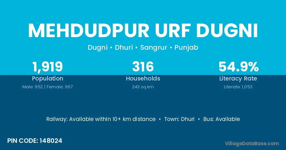 Dhuri is the nearest town to Mehdudpur Urf Dugni village for major economic activities