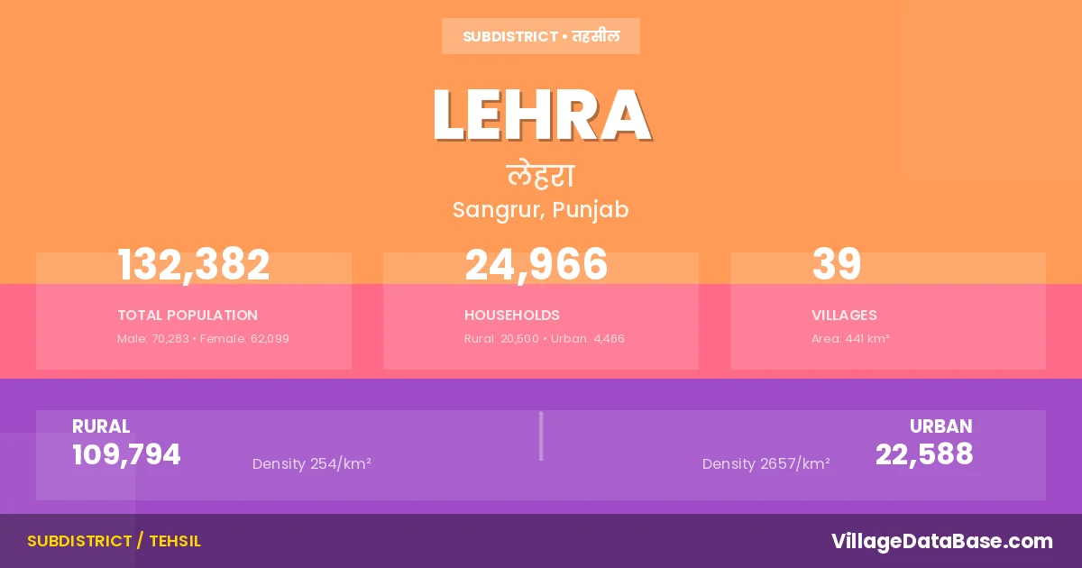 According to the 2011 census The total area of Lehra Tehsil is 441 km², with a population of 132382 people. The population density is 300 inhabitants per square kilometre, and there are approximately 24966 houses in the sub district.