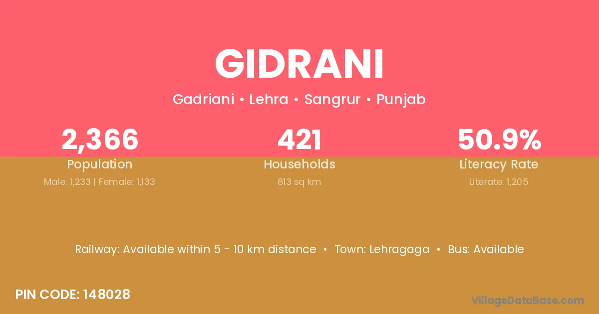 According to Census 2011 information, the village code of Gidrani village is 148028.