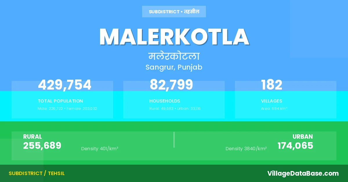 According to the 2011 census The total area of Malerkotla Tehsil is 684 km², with a population of 429754 people. The population density is 629 inhabitants per square kilometre, and there are approximately 82799 houses in the sub district.
