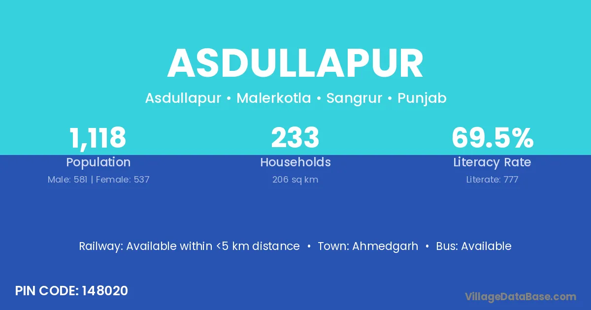 Asdullapur village has a total population of 1,118 people, of which 581 are males and 537 are females.
