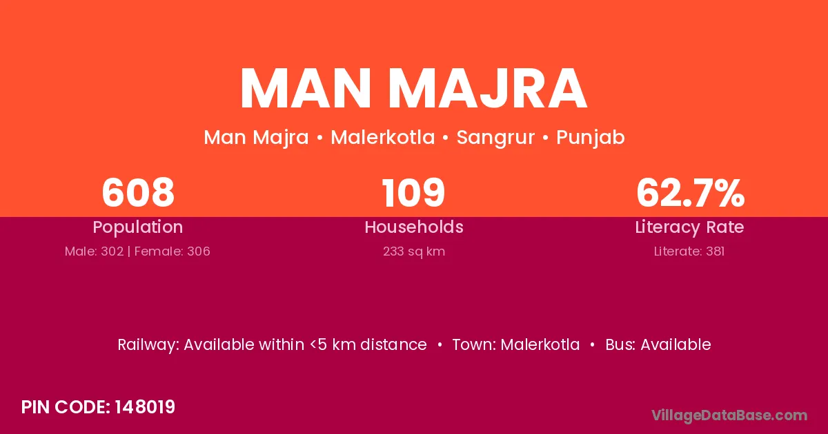Man Majra village has a total population of 608 people, of which 302 are males and 306 are females.