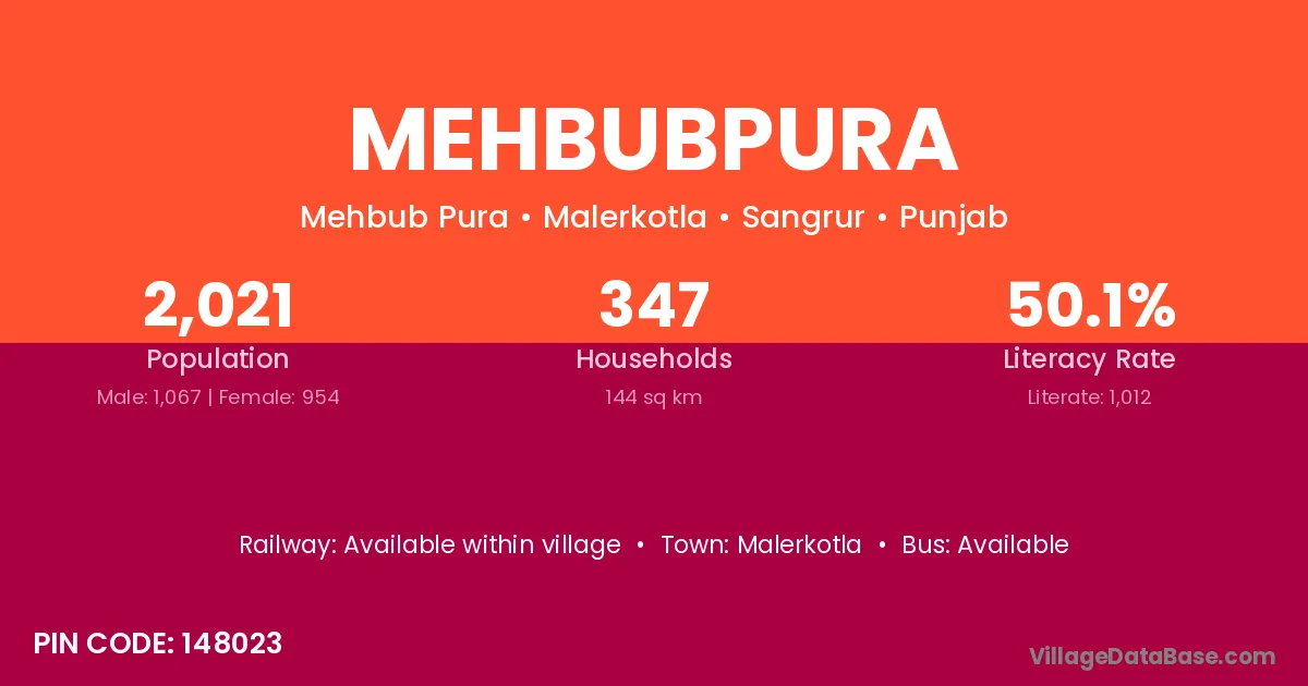 Mehbubpura village has a total population of 2,021 people, of which 1,067 are males and 954 are females.