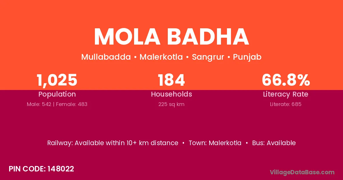 Malerkotla is the nearest town to Mola Badha village for major economic activities