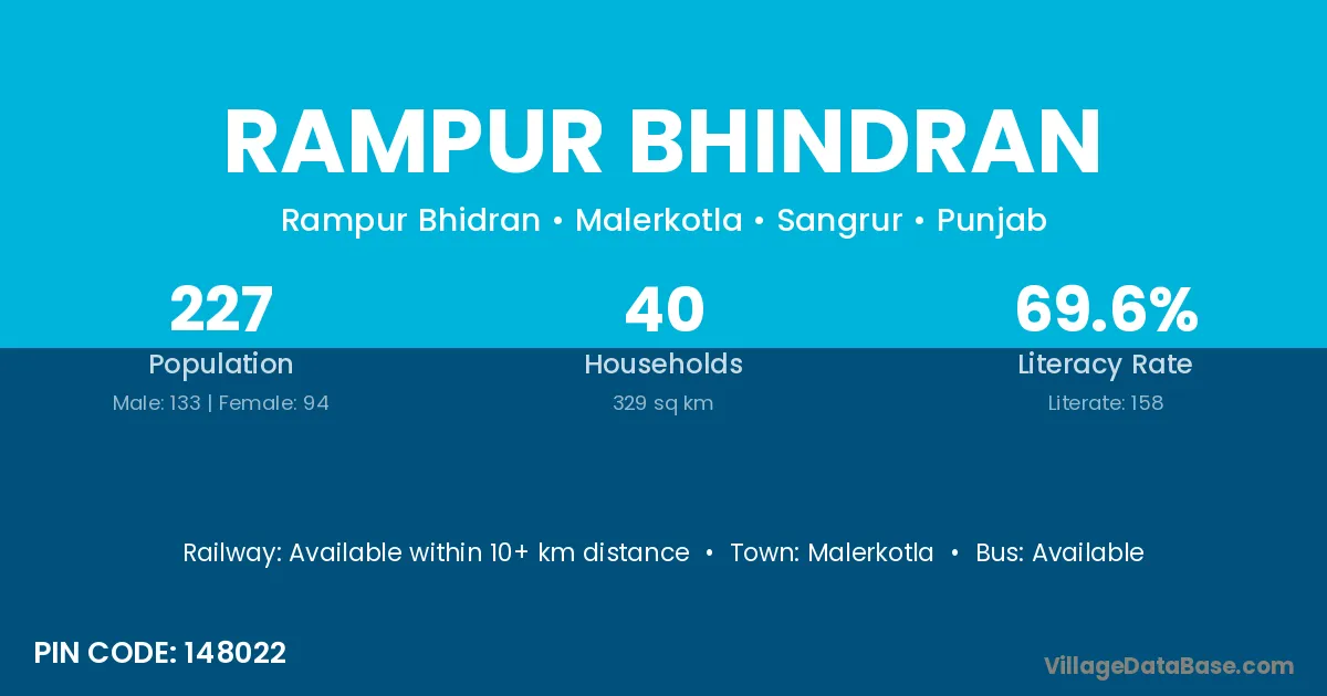 Rampur Bhindran village has a total population of 227 people, of which 133 are males and 94 are females.