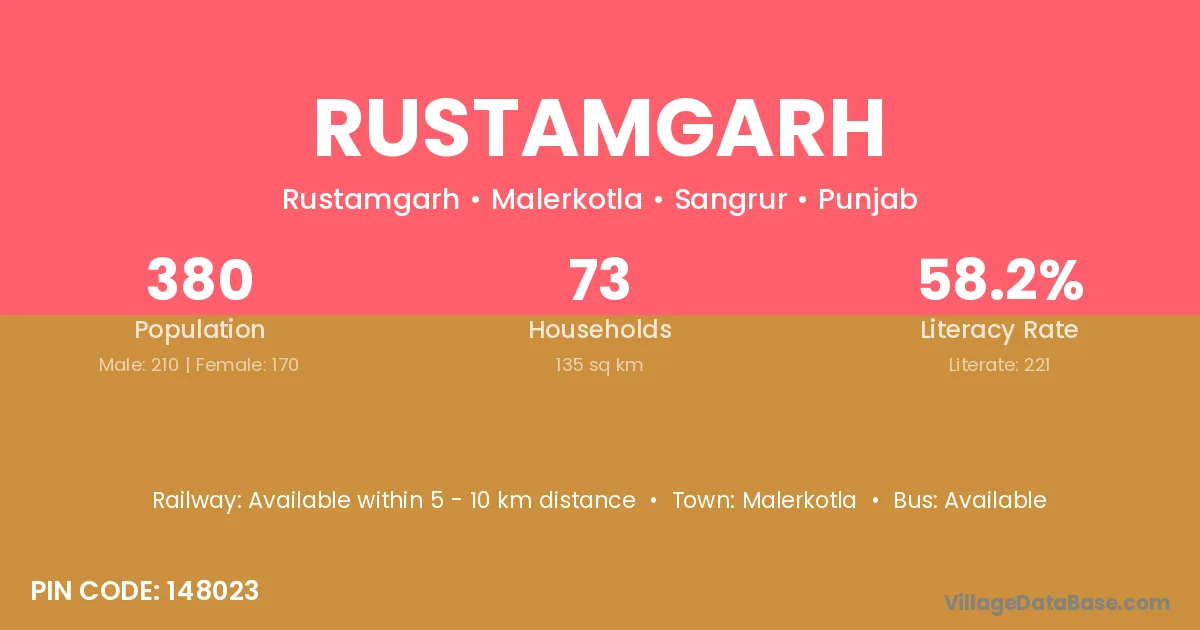 Rustamgarh village has a total population of 380 people, of which 210 are males and 170 are females.