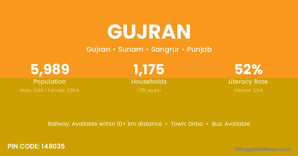 According to Census 2011 information, the village code of Gujran village is 148035.
