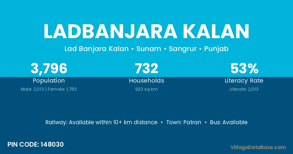 Ladbanjara Kalan village has a total population of 3,796 people, of which 2,013 are males and 1,783 are females.