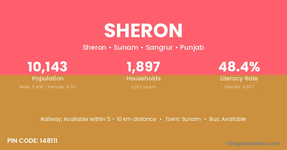 Sheron village has a total population of 10,143 people, of which 5,430 are males and 4,713 are females.