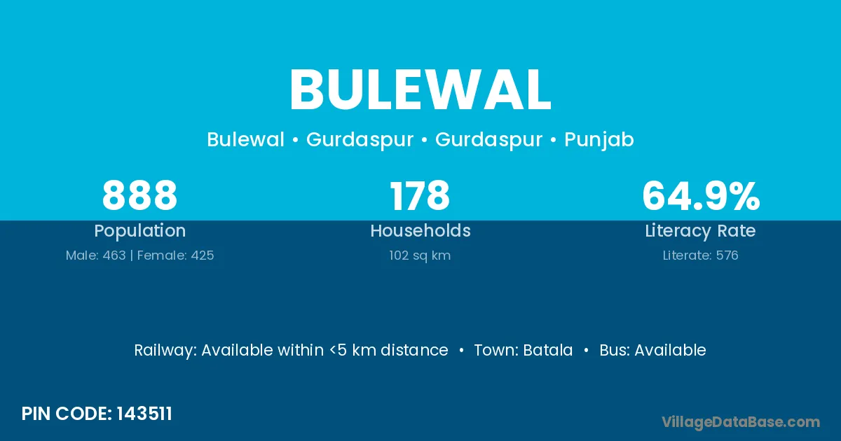 Bulewal village has a total population of 999 people, of which 504 are males and 495 are females.