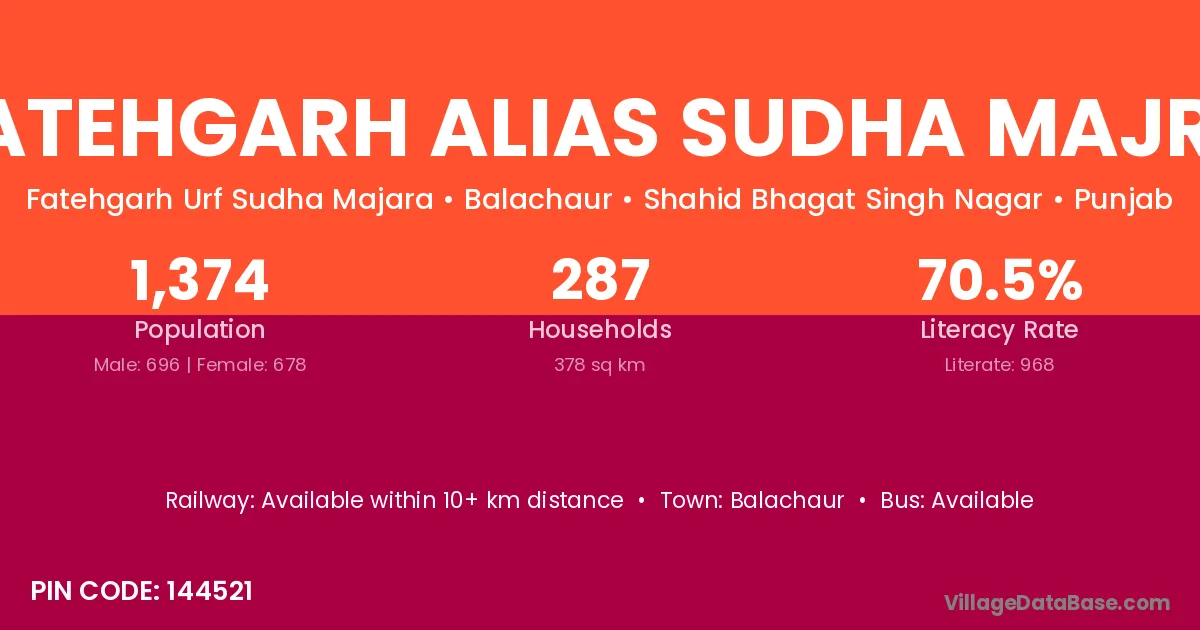 Fatehgarh Alias Sudha Majra village has a total population of 1,374 people, of which 696 are males and 678 are females.