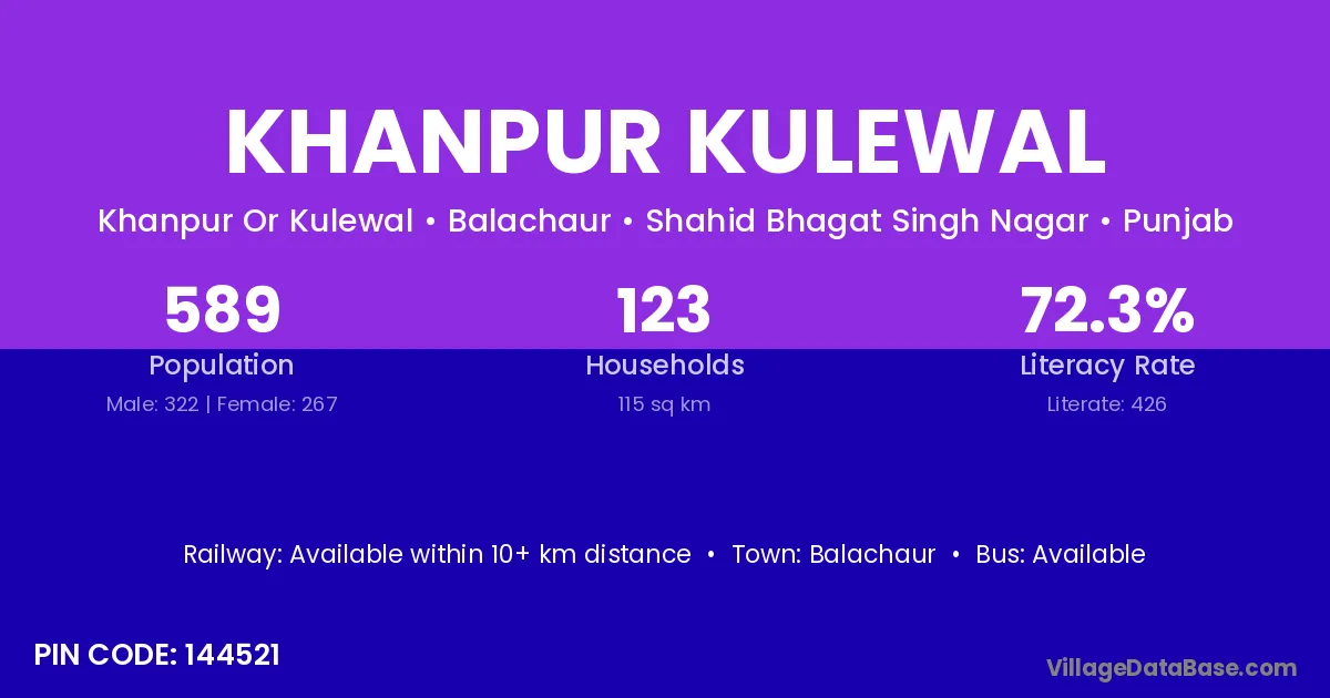 According to Census 2011 information, the village code of Khanpur Kulewal village is 144521.
