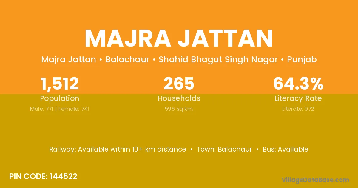 Majra Jattan village has a total population of 1,512 people, of which 771 are males and 741 are females.