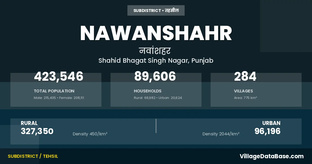 According to the 2011 census The total area of Nawanshahr Tehsil is 775 km², with a population of 423546 people. The population density is 547 inhabitants per square kilometre, and there are approximately 89606 houses in the sub district.