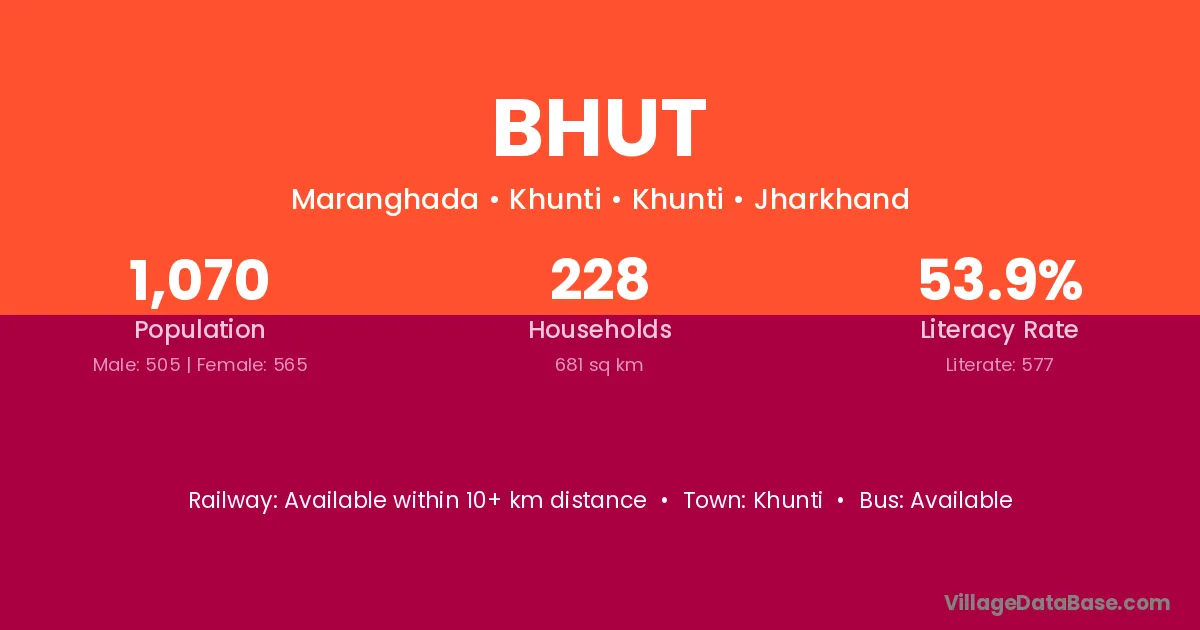 The literacy rate of Bhut village is 72.36%. Male literacy stands at 76.74% and female literacy at 67.82%.