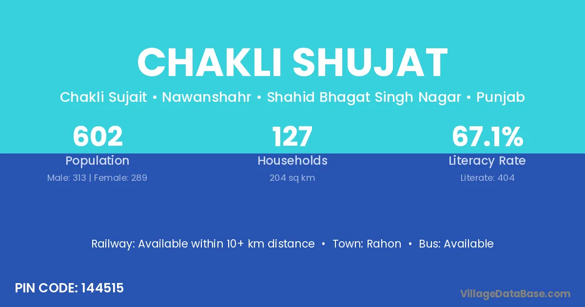 Chakli Shujat village has a total population of 602 people, of which 313 are males and 289 are females.