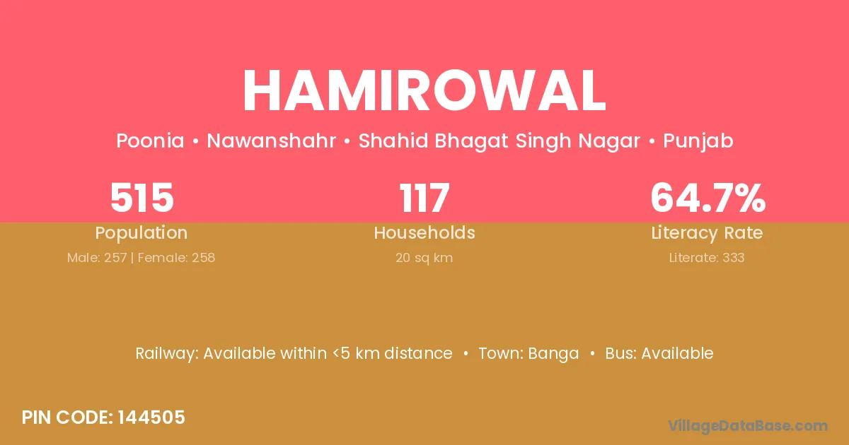 According to Census 2011 information, the village code of Hamirowal village is 144505.