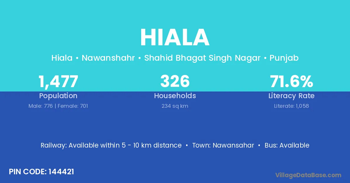 Hiala village has a total population of 1,477 people, of which 776 are males and 701 are females.
