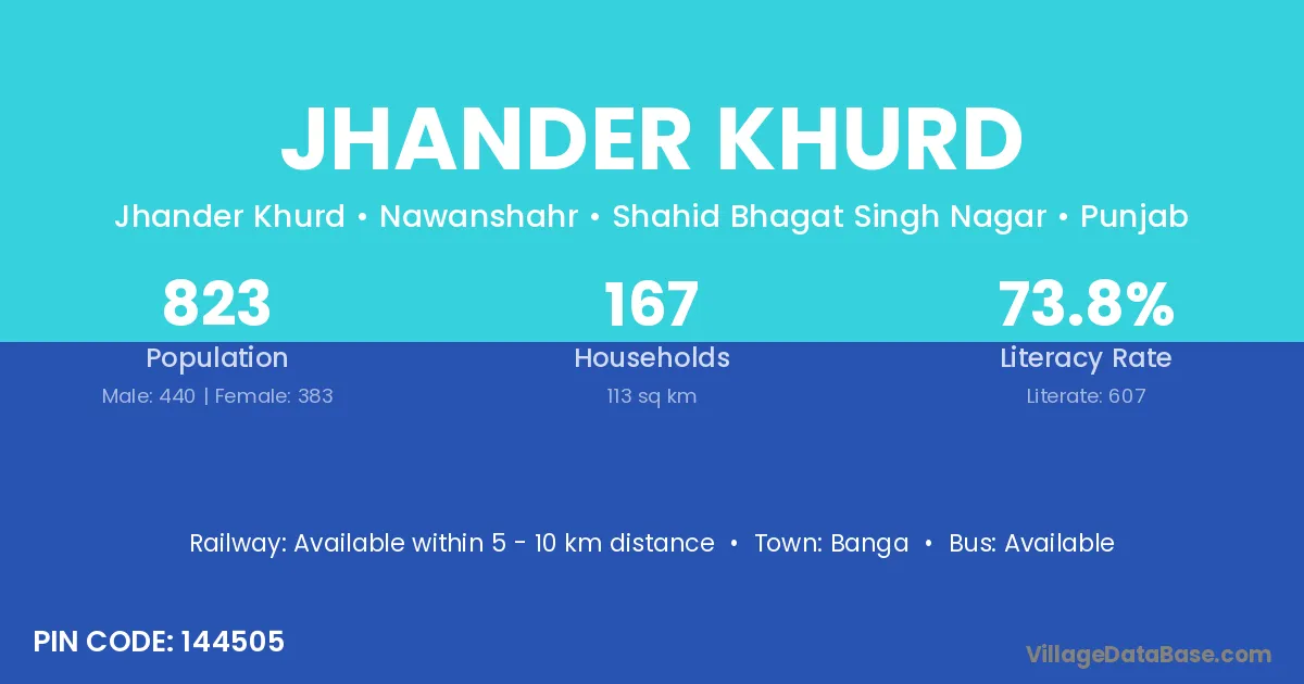 Jhander Khurd village has a total population of 823 people, of which 440 are males and 383 are females.