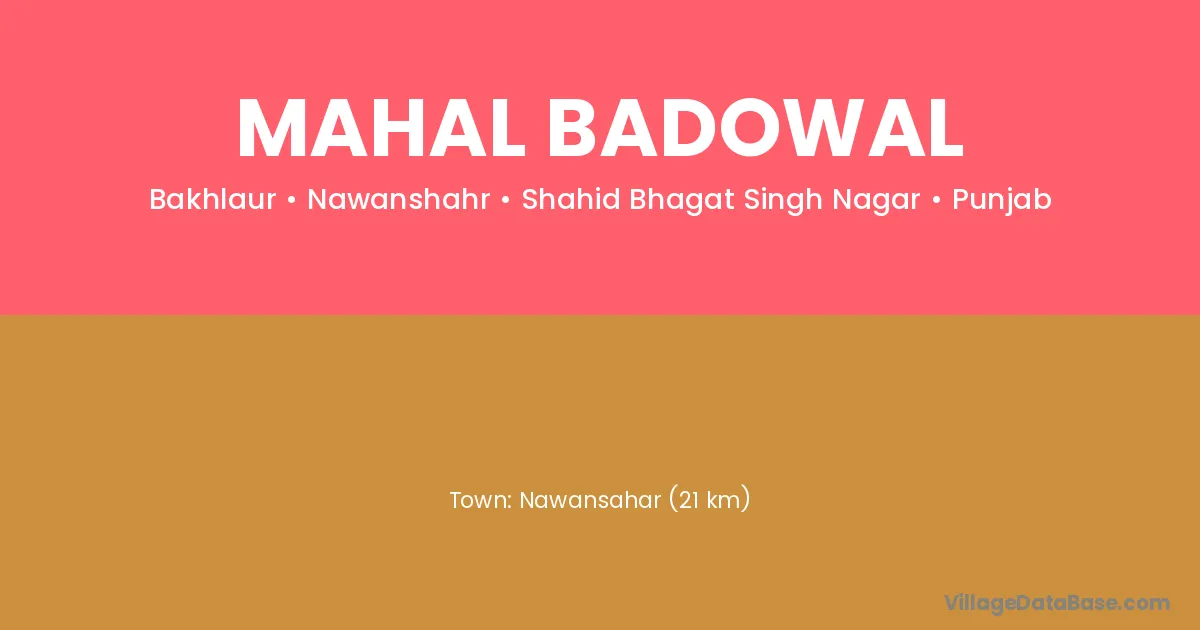 Nawansahar (21 km) is the nearest town to Mahal Badowal village for major economic activities and is located approximately 21 km away.