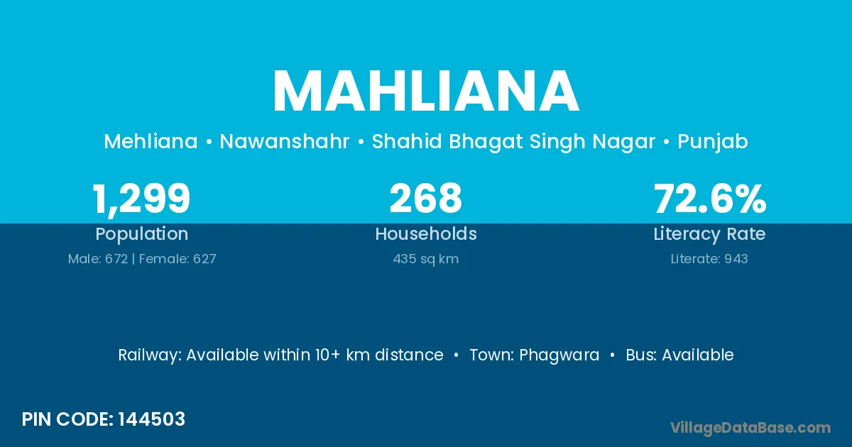 Mahliana village has a total population of 1,299 people, of which 672 are males and 627 are females.