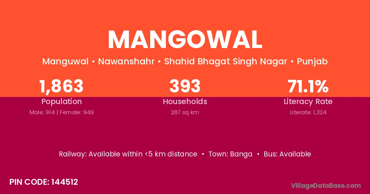 Mangowal village has a total population of 1,863 people, of which 914 are males and 949 are females.