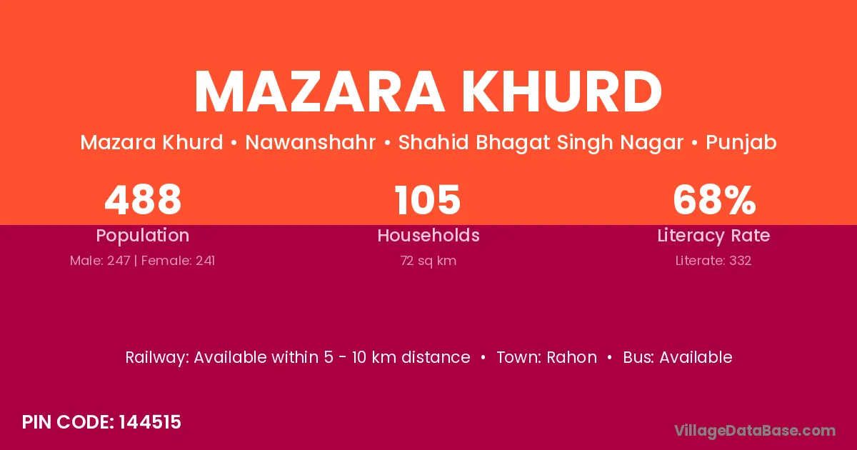 Mazara Khurd village has a total population of 488 people, of which 247 are males and 241 are females.
