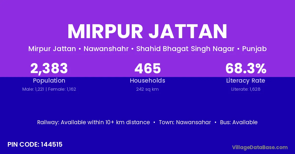 Mirpur Jattan village has a total population of 2,383 people, of which 1,221 are males and 1,162 are females.