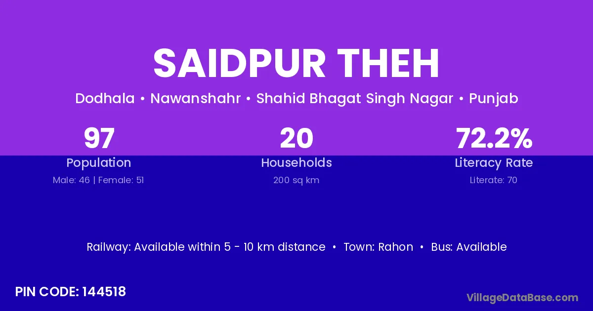 Saidpur Theh village has a total population of 97 people, of which 46 are males and 51 are females.