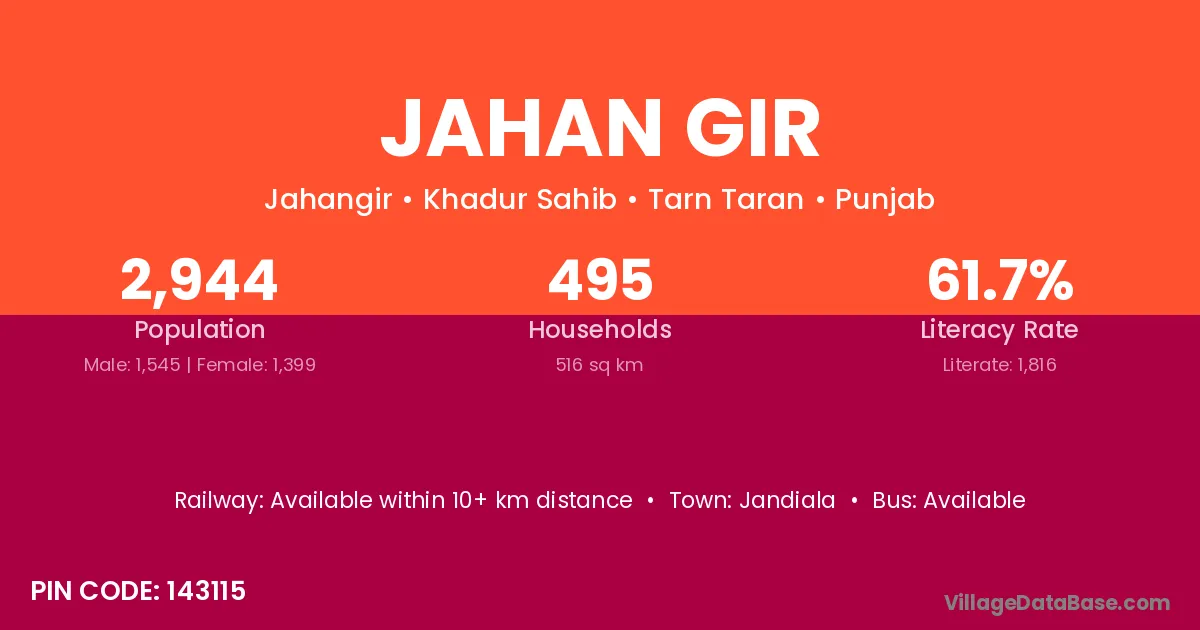 Jandiala is the nearest town to Jahan Gir village for major economic activities
