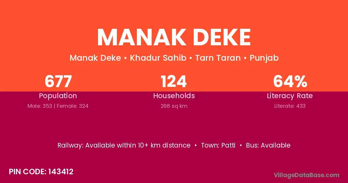 According to Census 2011 information, the village code of Manak Deke village is 143412.