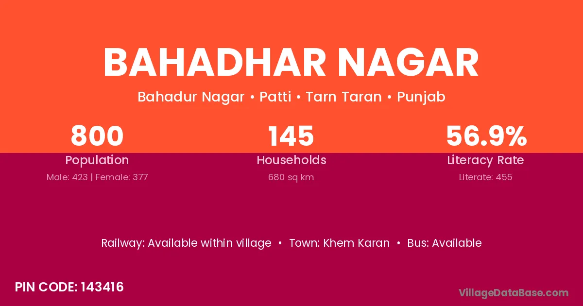 Bahadhar Nagar village has a total population of 800 people, of which 423 are males and 377 are females.