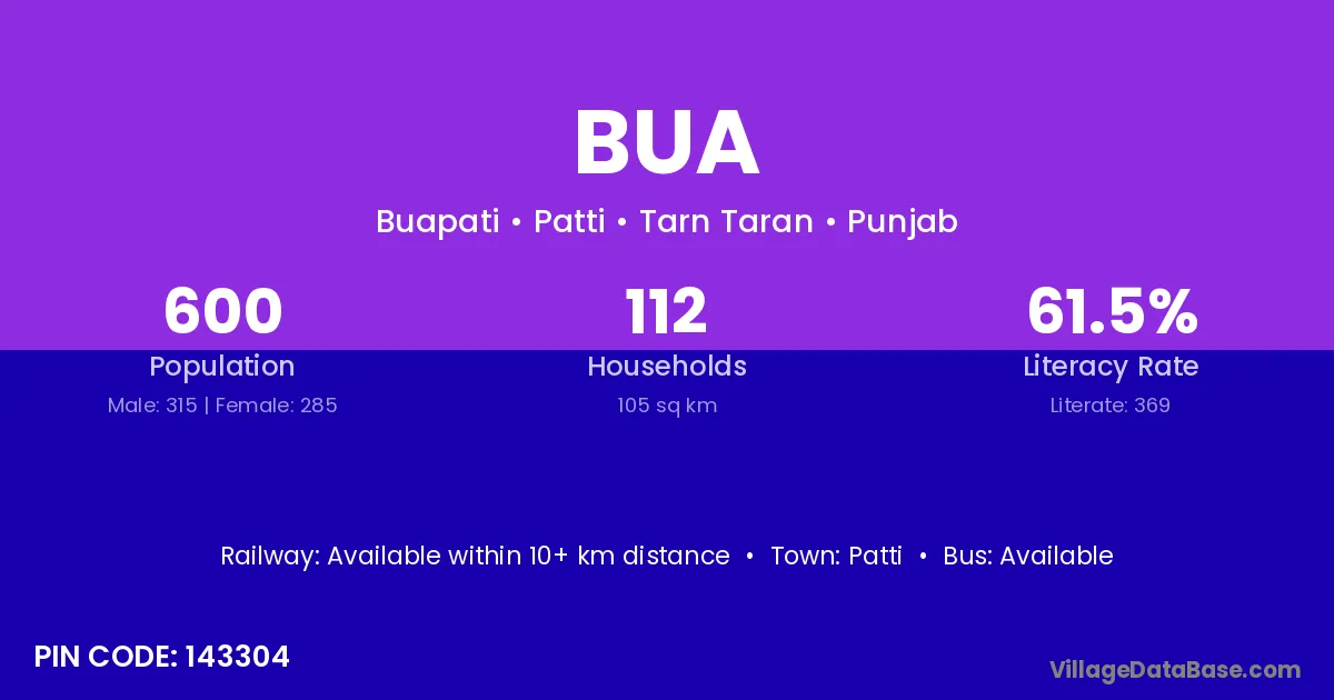 Bua village is located in the Patti Tehsil of the Tarn Taran district in Punjab .
