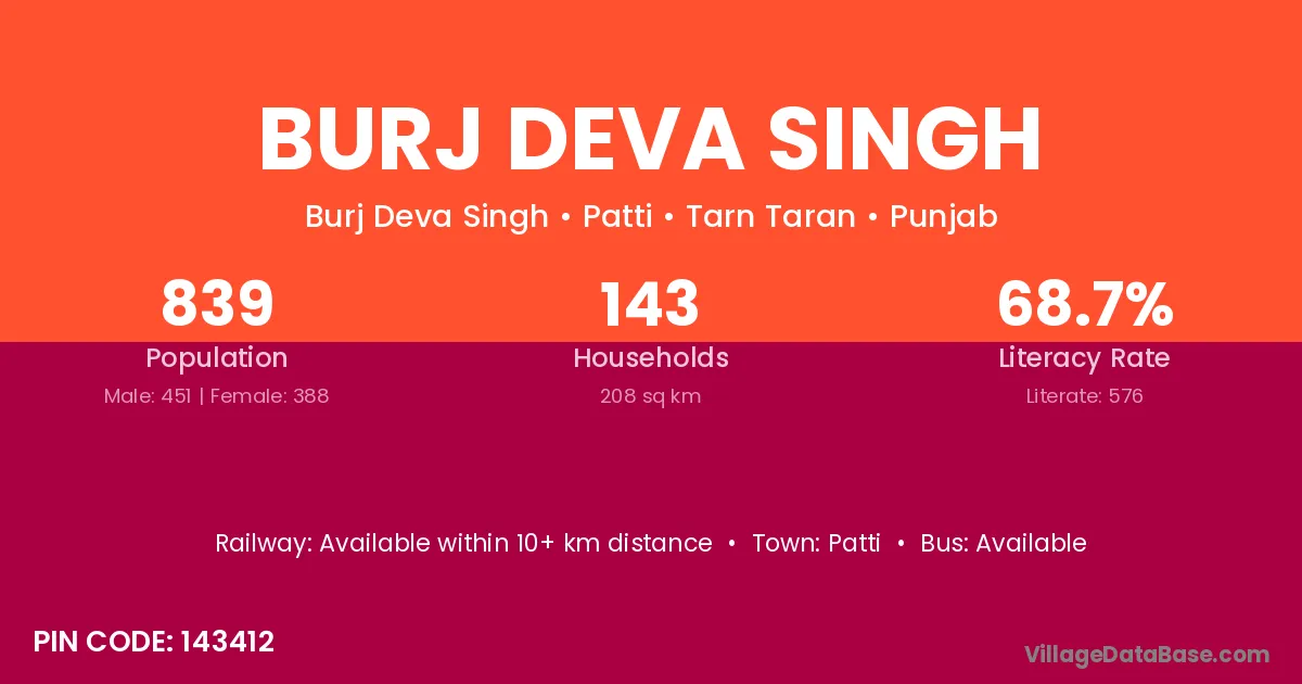 According to Census 2011 information, the village code of Burj Deva Singh village is 143412.