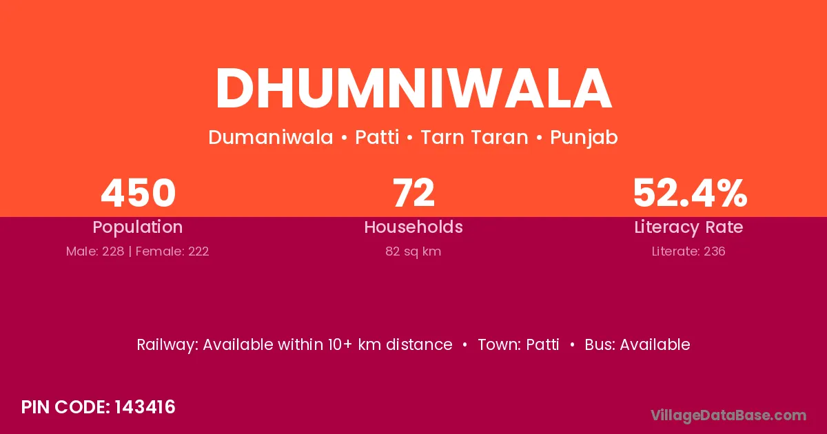Dhumniwala village has a total population of 450 people, of which 228 are males and 222 are females.