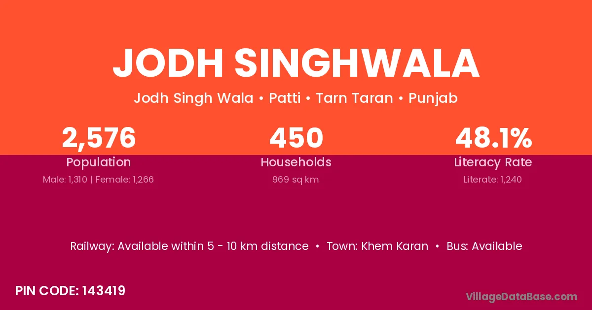 Jodh Singhwala village has a total population of 2,576 people, of which 1,310 are males and 1,266 are females.