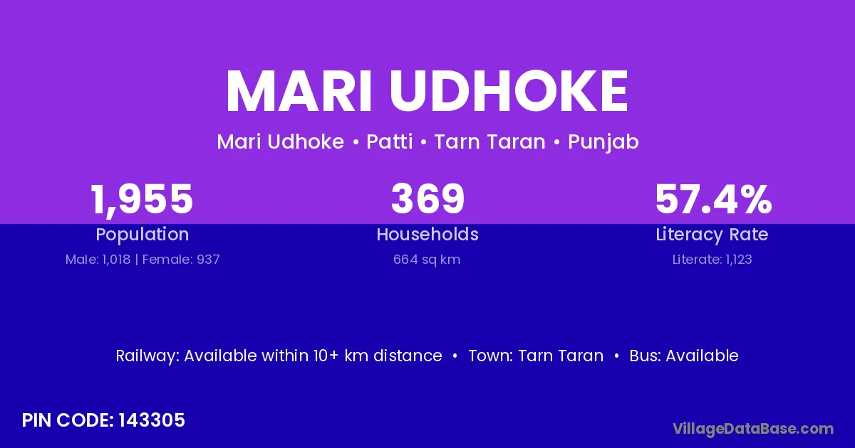 Mari Udhoke village has a total population of 1,955 people, of which 1,018 are males and 937 are females.